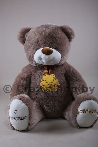 - Особенности: музыкальный, на лапе вышито "С любовью", на груди табличка с надписью "Возьми меня с собоой".